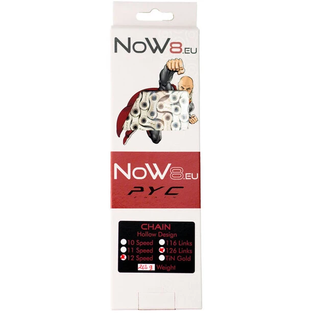 La chaîne NOW8 PYC est compatible avec une transmission à 12 vitesses et possède un design Hollow. Il s’agit de la version longue avec 126 maillons.