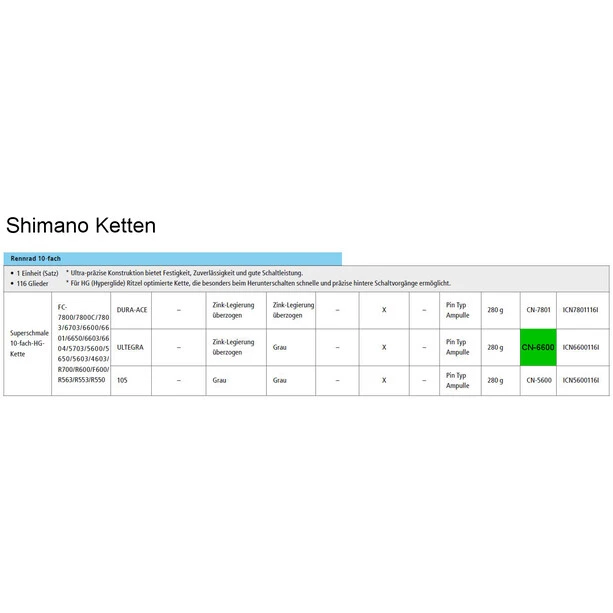 - Chaîne HG super mince à 10 vitesses / compatibilité avec les groupes : Dura-Ace, Ultegra, 105, Tiagra