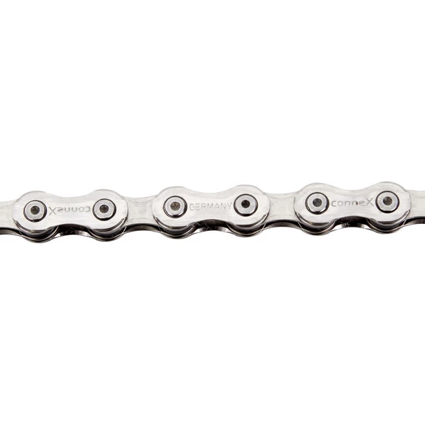 Chaîne Wippermann Connex 908 chaîne nickel entièrement nickelée. Avec des plaques extérieures extrêmement profilées pour des performances de commutation parfaites Caractéristiques:- 279 g- 114 maillons – 9 fois nickelés- Connex Link